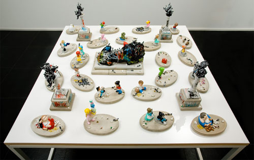 Impish and sweet characters engage in vandalism, littering, violence, self-abuse and more in this sculptured narrative. Babies booze it up, little girls shoot rats for fun and muggings run rampant in this miniature world. Brandishing everything from alcohol to guns, the ceramic and enamel-painted subjects, who resemble Hummel figurines gone bad, are placed atop round slabs of concrete (this is the first time Barford has used concrete in his work).